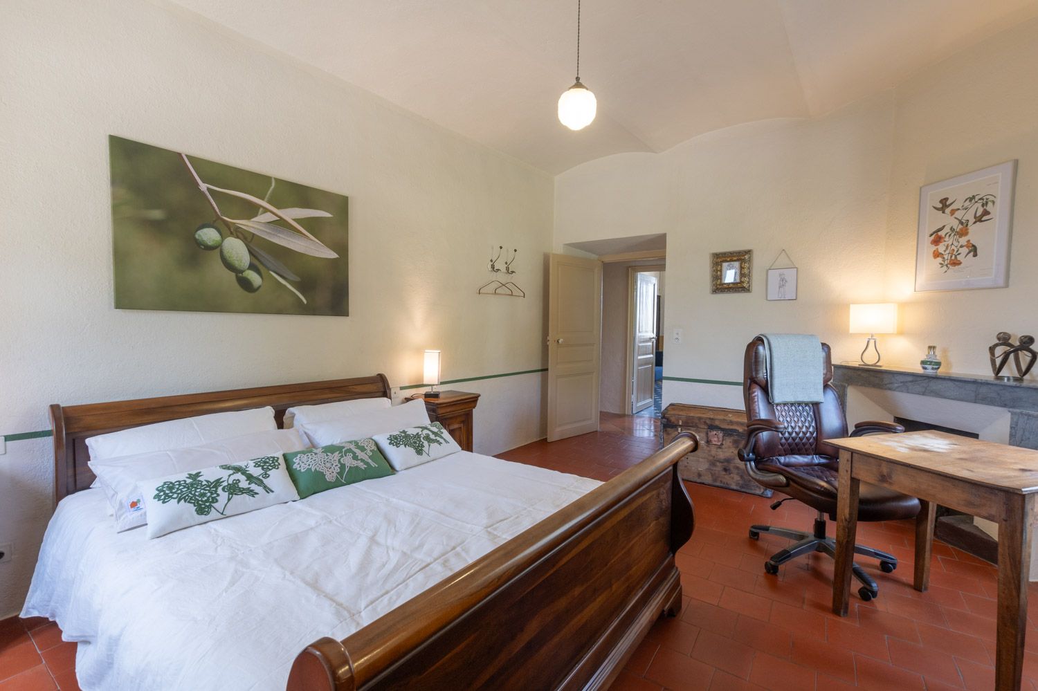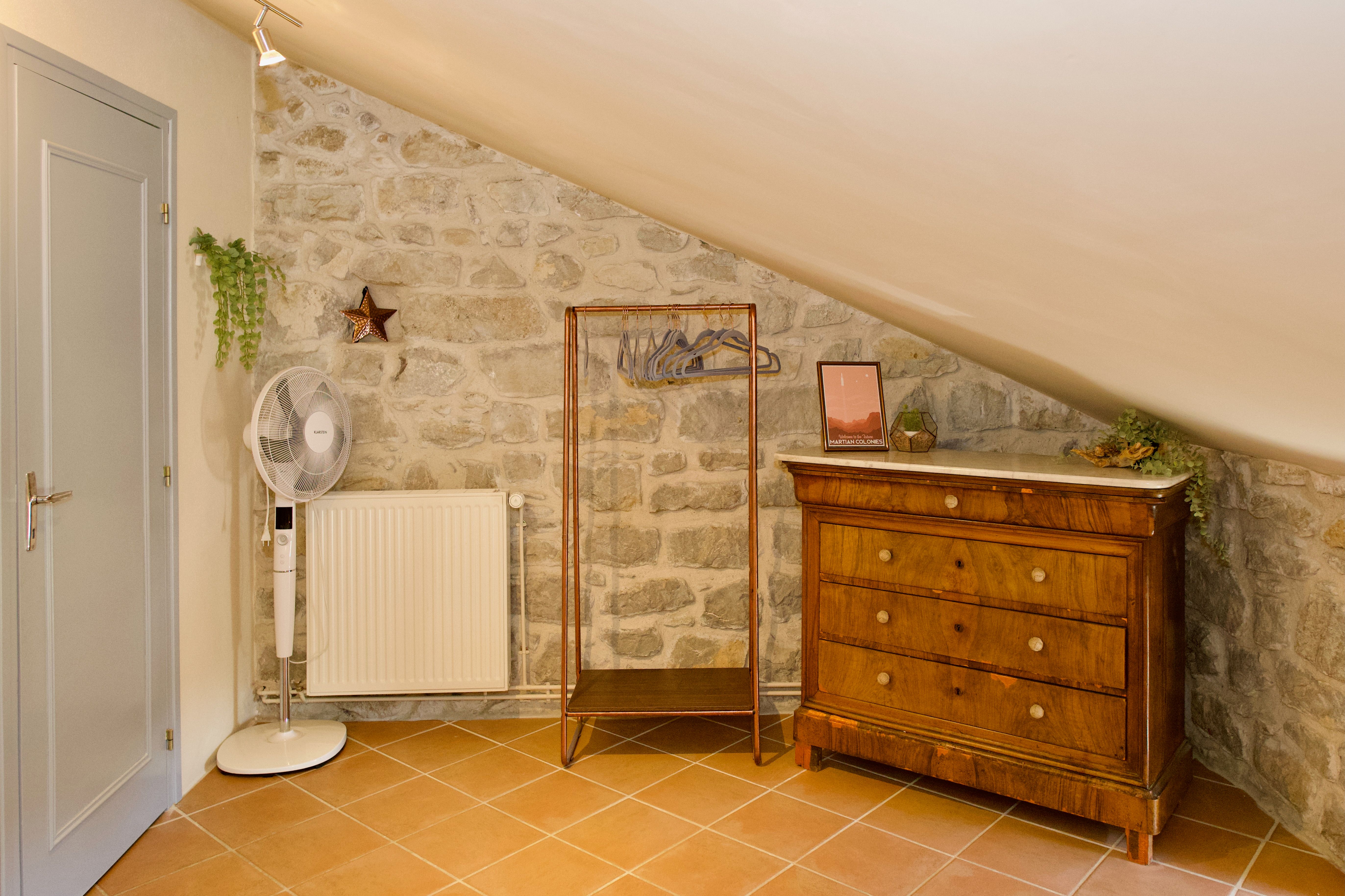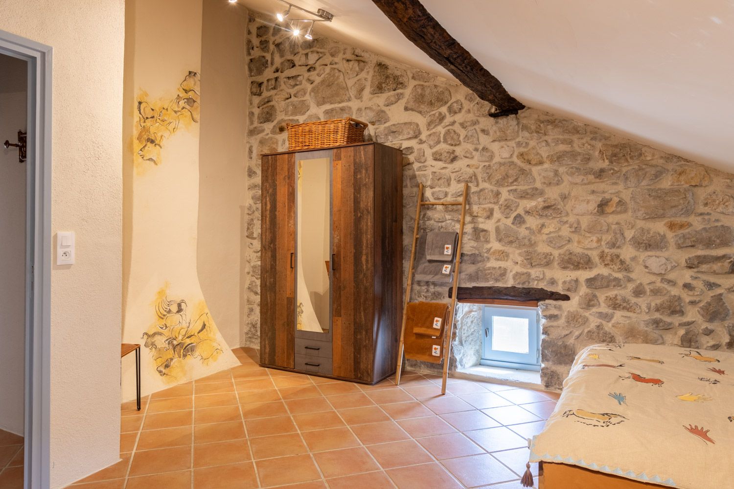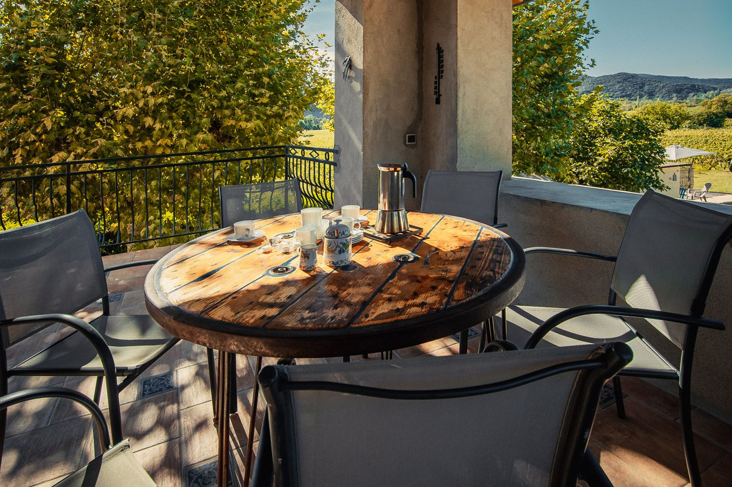 Traditionally, the living areas of an Ardèchois „Mas“ are on the 1st and 2nd floors. A large staircase leads to the roofed terrace with dining table and breathtaking views of Mont Sampzon, Ardèche and the adjacent vineyards.
