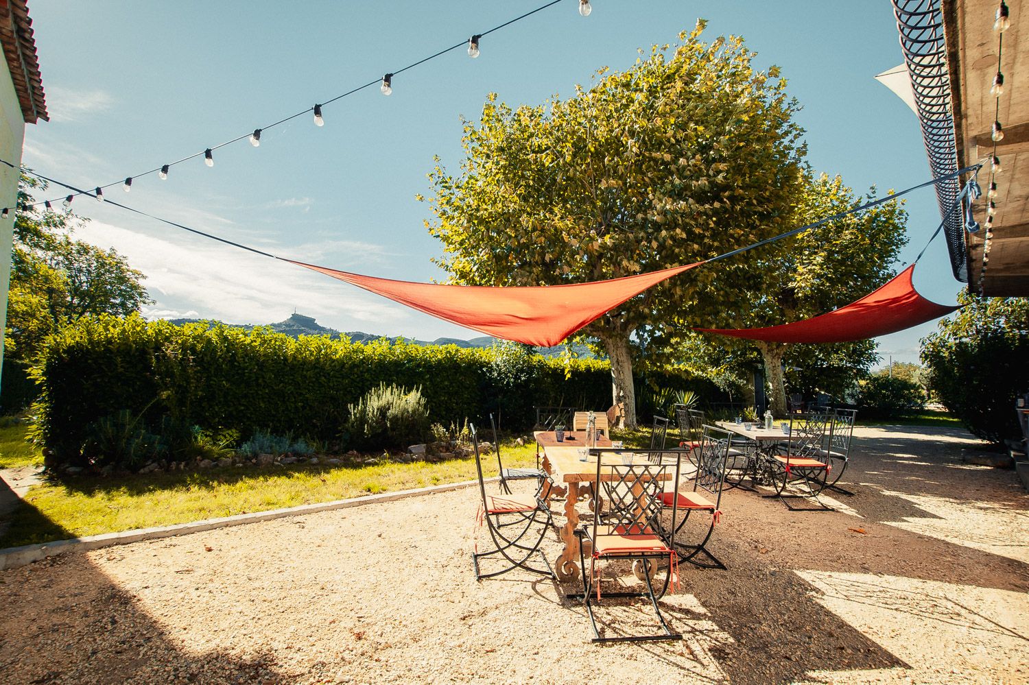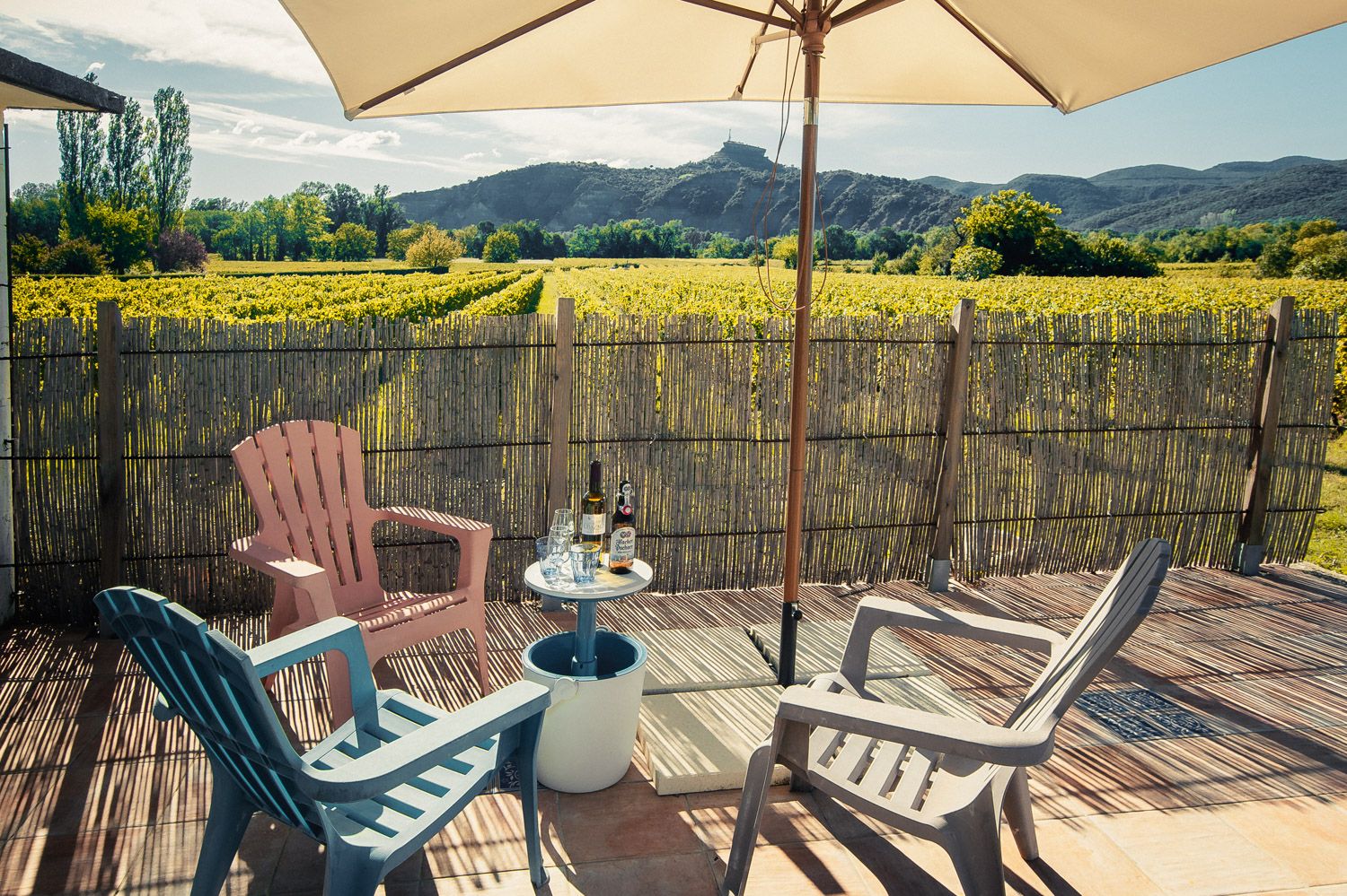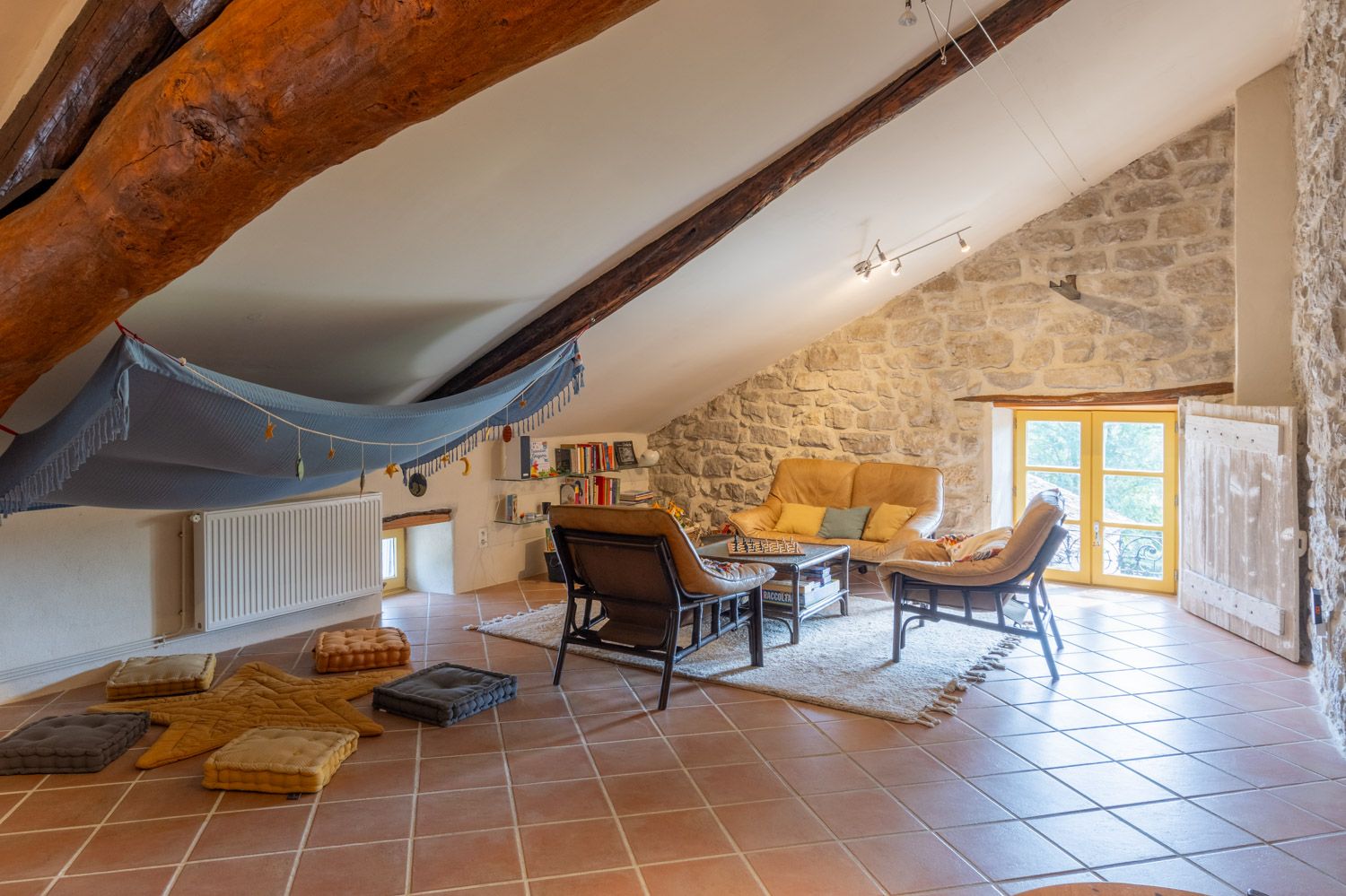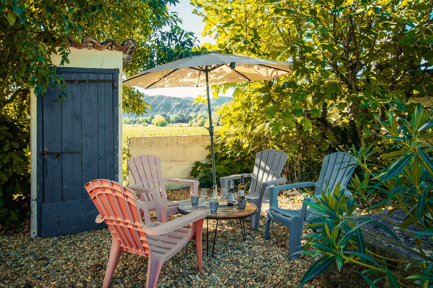 Traditionally, the living areas of an Ardèchois „Mas“ are on the 1st and 2nd floors. A large staircase leads to the roofed terrace with dining table and breathtaking views of Mont Sampzon, Ardèche and the adjacent vineyards.