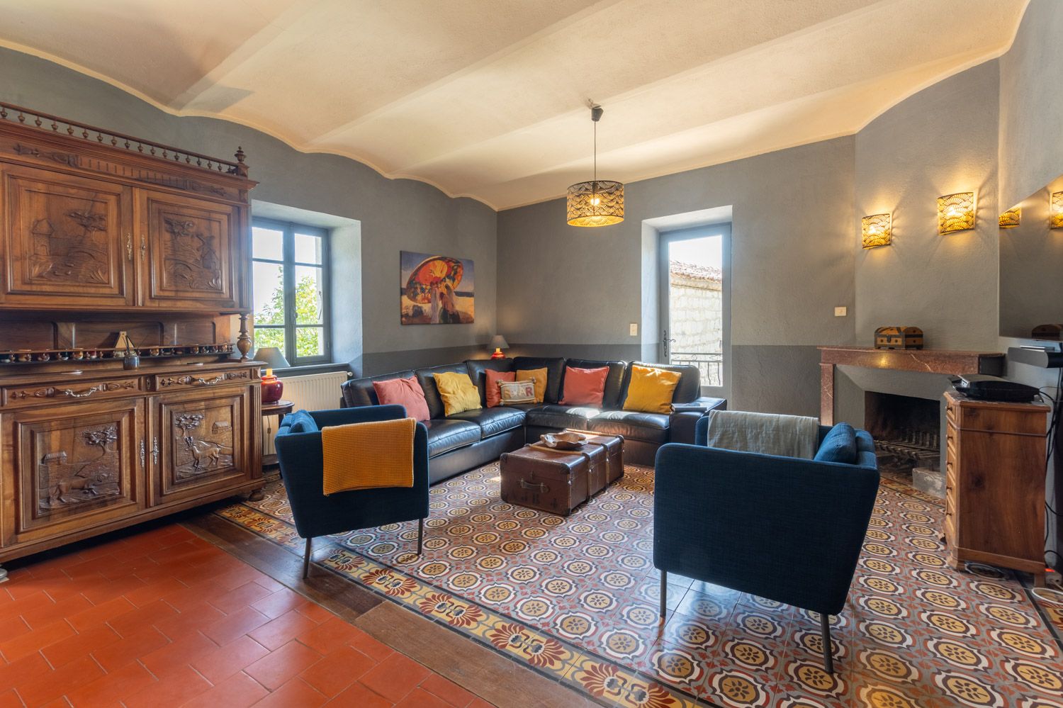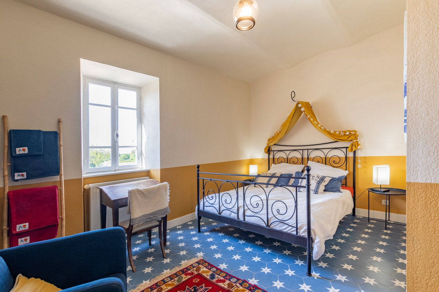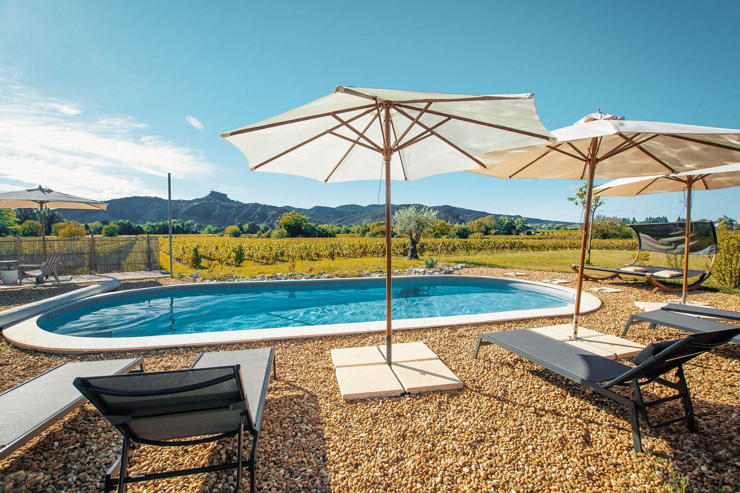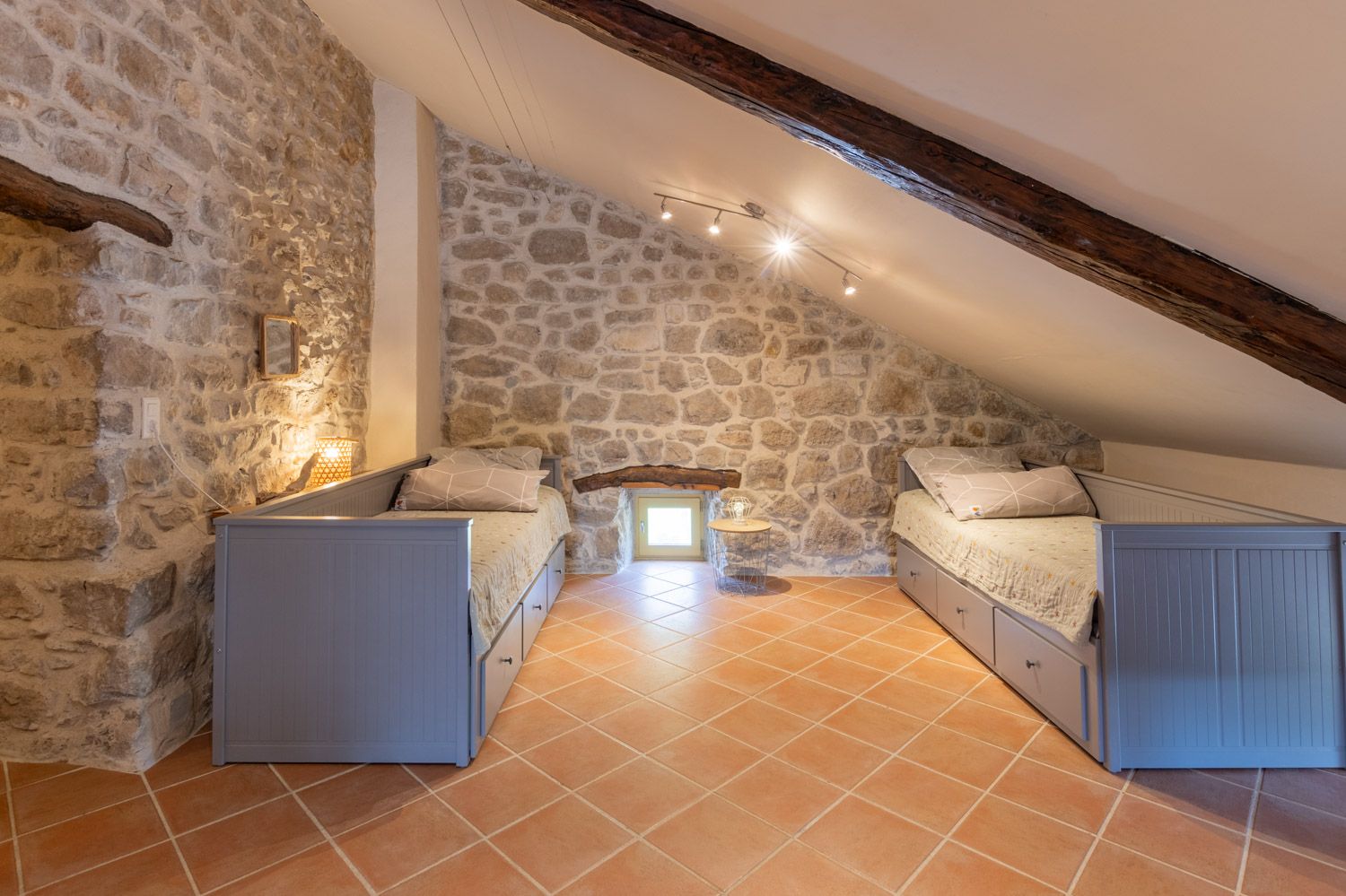 Traditionally, the living areas of an Ardèchois „Mas“ are on the 1st and 2nd floors. A large staircase leads to the roofed terrace with dining table and breathtaking views of Mont Sampzon, Ardèche and the adjacent vineyards.
