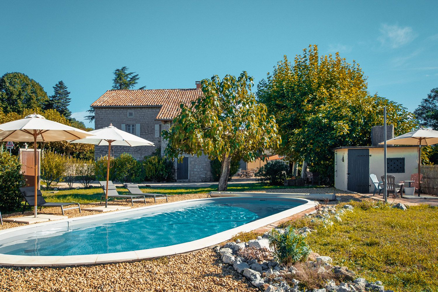 The garden also contains the 9.5 x 4 m pool with safety cover, pool house with terrace, high-quality loungers, solar outdoor shower and lighting. Between the pool area and the courtyard there is a cozy seating area under the fig tree by the old grindstone. At the back of the garden you can play soccer, frisbee etc.